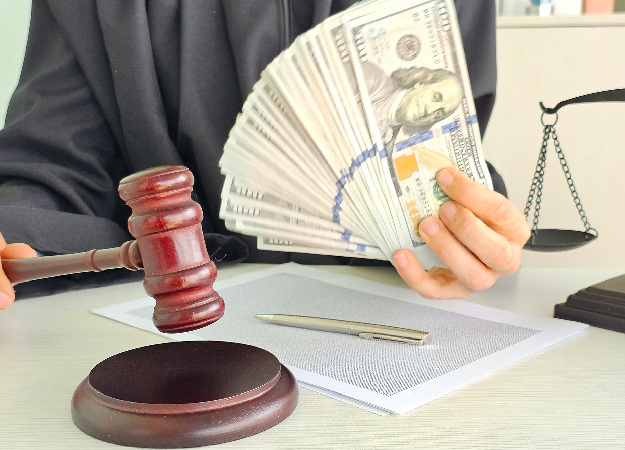 Gavel, money, scales, and pen on desk.